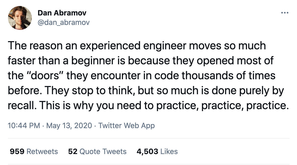 For an insightful take on being comfortable with what you don’t know, read this great blog post by one of the most well-respected and influential JavaScript developers out there right now: Dan Abramov, Things I Don’t Know